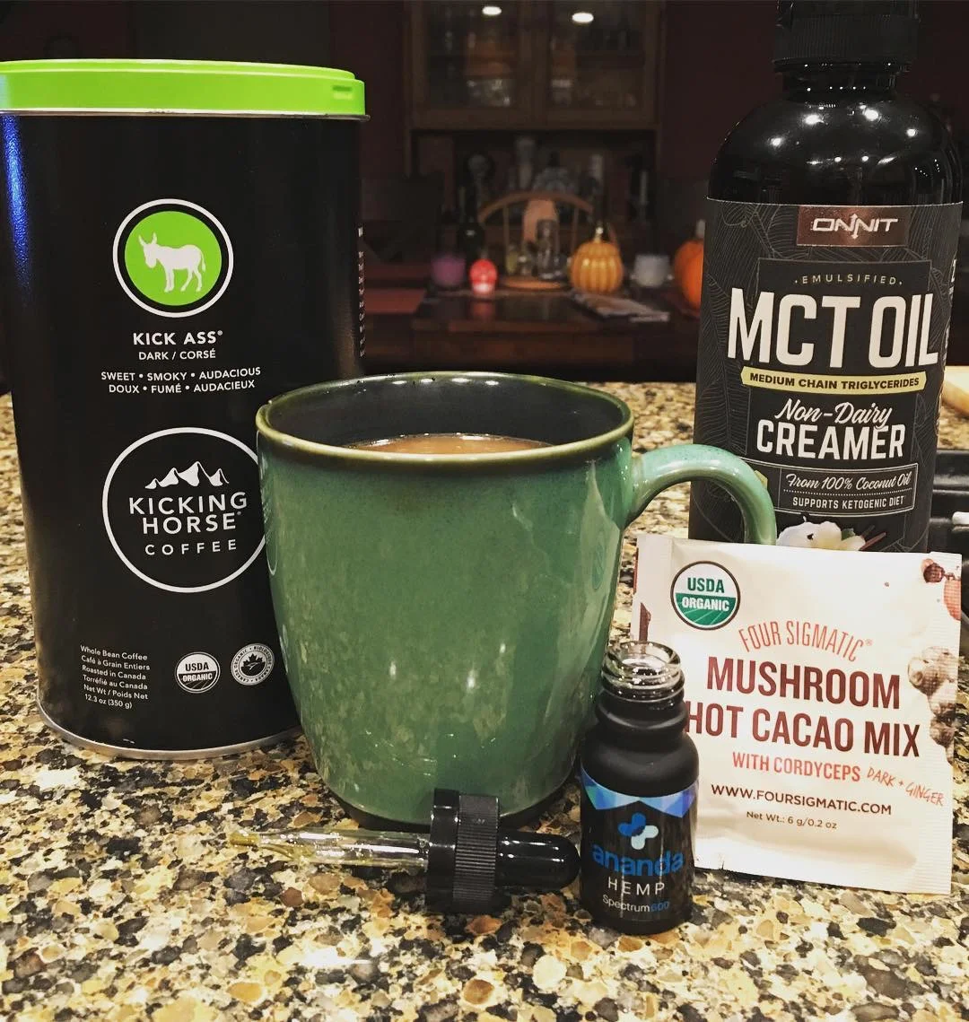 Down to the last dropperful of Ananda Hemp , last packet of Four Sigmatic Mushrooms Cacao Mix and last drop of Onnit MCT Oil but plenty of Kicking Horse Coffee